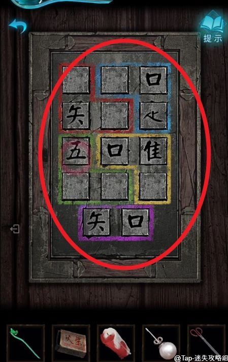13.返回外屋,点击桌子,将得到的甲乙(甲乙图形线索在竹简下方的石头上)丙丁图形密码跟桌子上铜钱组合(甲图形为中间加上右侧的方格,代入铜钱可得出是唯,同理代入其他图形),按照灶台内甲乙颜色输入密码打开抽屉,得到【刺绣】,将【断箭】与【刺绣】组合成新道具【团扇】。13 13.1