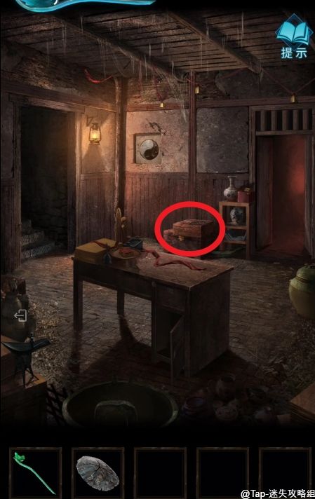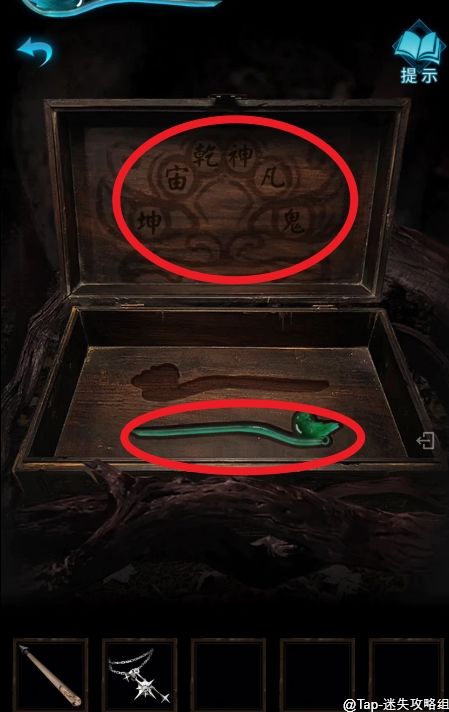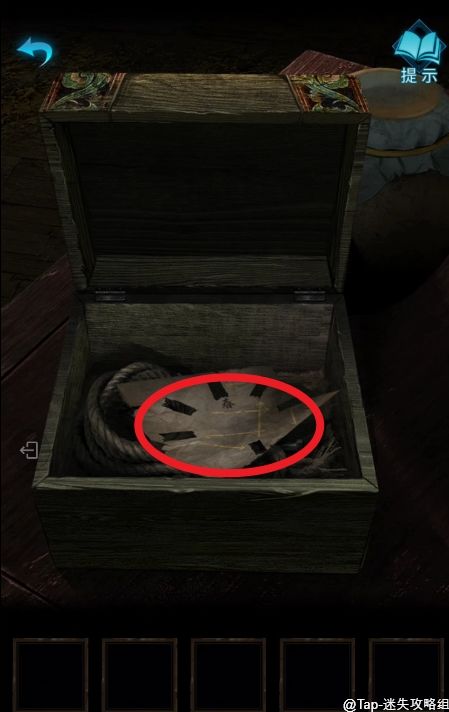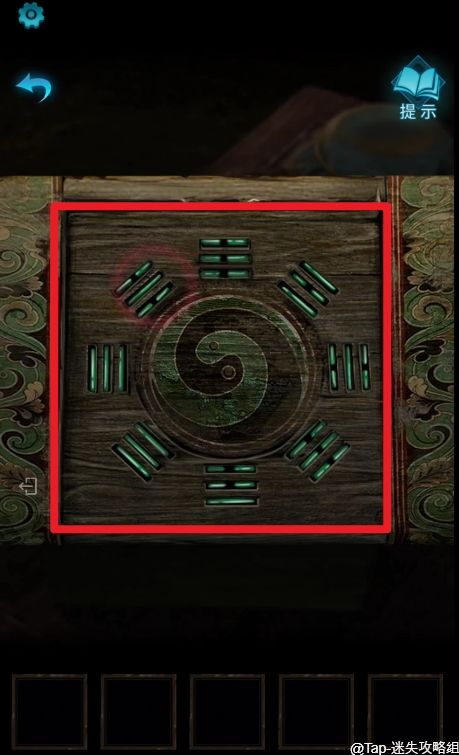 23.返回屋内,点击桌子上盒子,按照古镜中的提示变动箱子上的符号,如图所示打开箱子,之后得到一张有破洞的纸。23 23.1