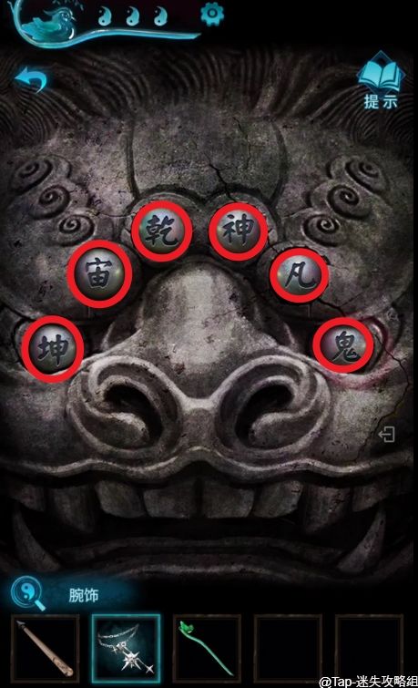 8.返回下方完成对话,回到戏台,点击戏台旁边石狮子头部,将盒子上文字:坤宙乾神凡鬼输入,打开旁边的石门,推动石门进入。8 8.1
