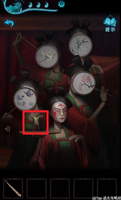 7.将酒倒在崖顶的大树旁,倒完酒就会出现盒子,回到戏台点击舞女的脸谱,将脸谱上的图形与扇子花纹一一对应,就能打开盒子,拿走【玉簪】。7 7.1