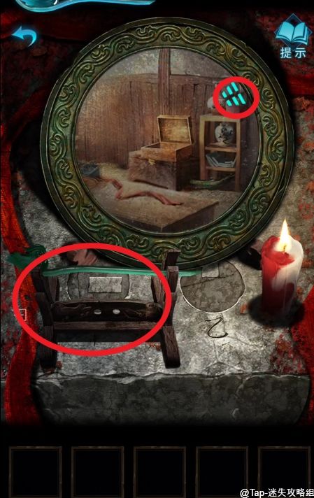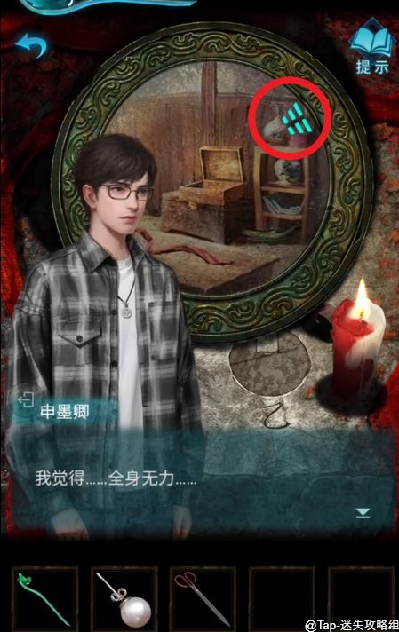 15.返回车旁点击祭坛,将【古镜】放置在祭坛上,根据【古镜】提示的线索,将【杂色蜡烛】放在祭坛并点燃,古镜开始闪烁,将闪光符号记录下来。 15 15.1