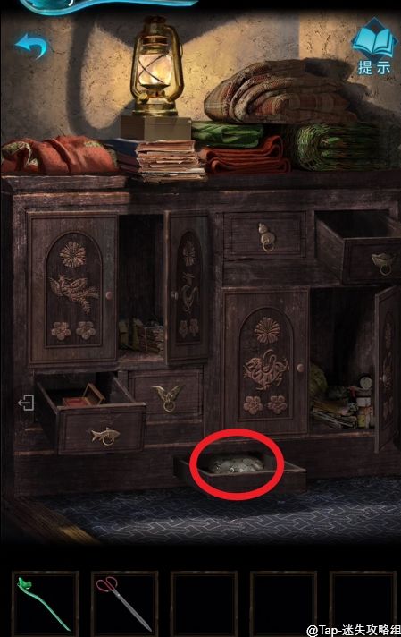 11.拿到钥匙将石洞下方的门打开,进入房间,利用【腕饰】将柜子上胶布划开,打开抽屉,获得【木像】、【杂色蜡烛】、【珍珠耳环】。11 11.1