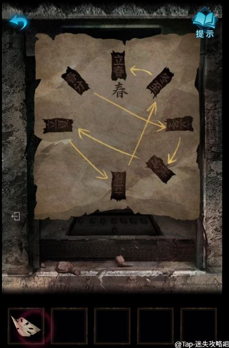 24.返回祭坛攀爬悬崖,前四次都会失败,爬上悬崖后,点击树下的神龛,将破洞的纸放在神龛中,根据破洞和指向得出暗号春分→立冬→秋分→立夏→立秋→冬至→立春。24 24.1