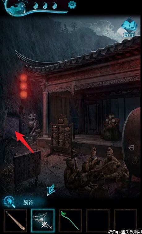 2.进入下方戏台场景,观察门口牌子,观察门牌上文字退出,点击右下角陶勇,将陶俑背后【断箭】拿走。2 2.1