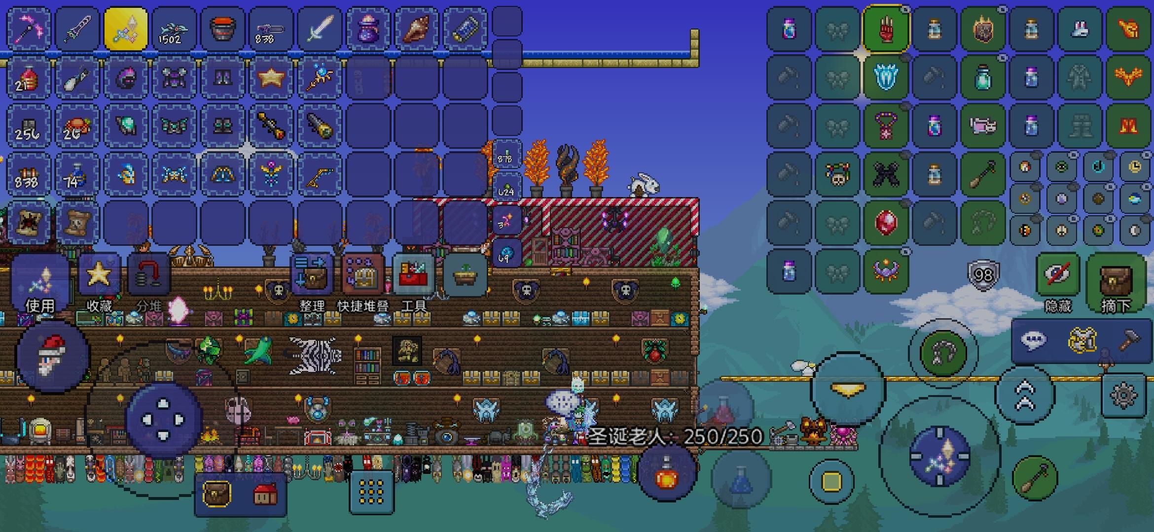 具体配饰,我舍弃了护佑,全部换成险恶,两个镜子,忍者大师,飞行之证,猪鲨翅膀,星星项链,天界壳,混乱脑,蘑菇套加甲虫套来回切。开局蘑菇套(弓箭),吃满药,召唤个三节的虫,弓箭对天,隐身等月总,月总刚出来没3秒,脑门的眼睛直接爆了,然后立马切甲虫套,两个镜子取下来用星星项链和混乱脑,拿着机枪叶绿弹边躲边射(叶绿弹射就完了),中间两次丝血去找了护士,心脏阶段切回了蘑菇套(枪弹加成),闪躲射击,最后丝血击杀了月总心脏。之后趁着药效没过,就又召唤了一次,这次就去了一下护士那里就过了。后面开出了海豚枪,月总就彻底没难度了。之后打了撒坦军团,把天顶剑做了出来,又去接着打了白天光女,泰拉棱镜也有了,最后把霜月过了,至此所有内容体验完毕(除了黑长直搭平台和月总两次护士,所有流程正常玩完,没有逃课,体验非常舒适)。