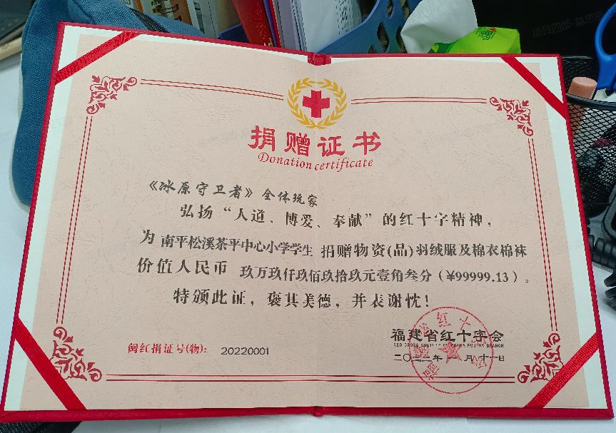 目前孩子们的物资已经全部到位啦!福建省红十字会给我们冰原发来了捐献证书!