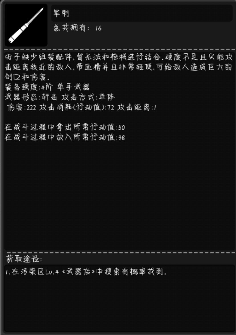 ③用法很尴尬,靠伤害要吃操作,新手不会用。靠流血那为什么不用更容易获得的猎刀呢。一格的攻击距离还会被反击。