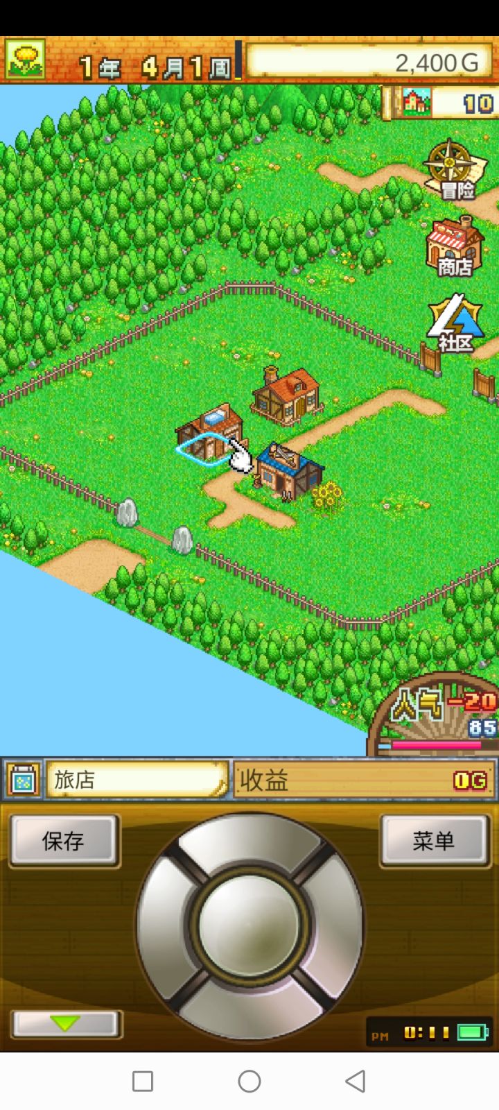 开局先建个防具店,让袁田入住,在旅馆使用道具牛排,留下武器店和旅馆其他拆掉。