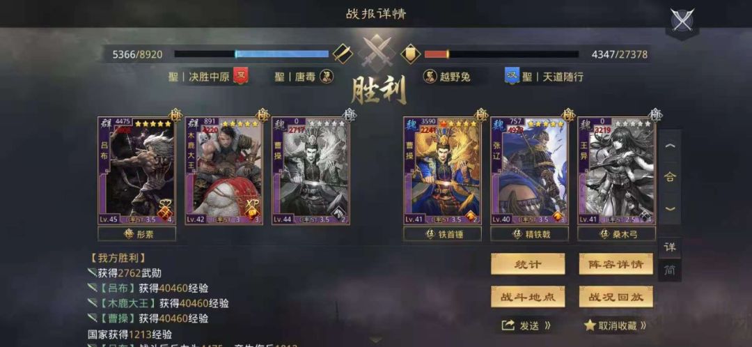 武将选用了神级辅助曹操,这里曹操也可以使用其他的步兵或者骑兵前锋武将。中军木鹿和鬼吕双核输出弥补大营战法不足导致的输出不足。