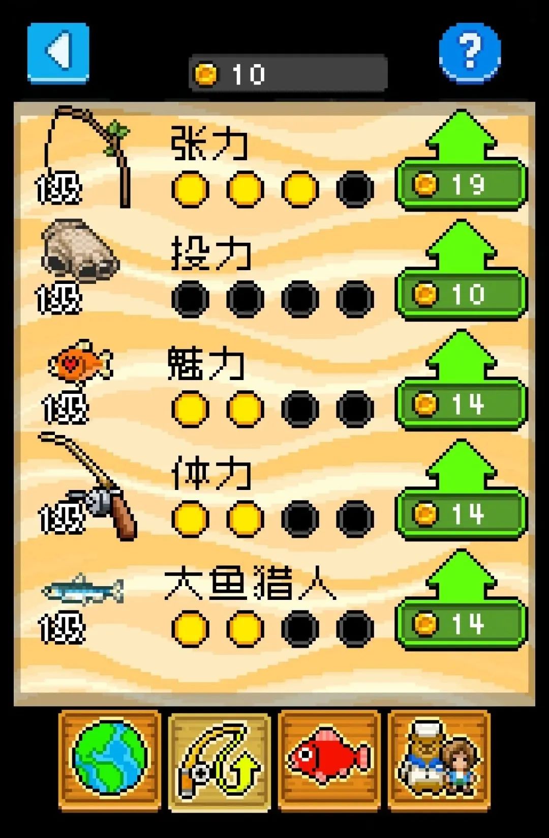 当然如果松手释放鱼线的压力也还是钓不上鱼,这个时候就需要升级鱼竿的能力值了,每个能力对应一定的鱼竿功能,点击“?”即可查看每个能力的作用。
