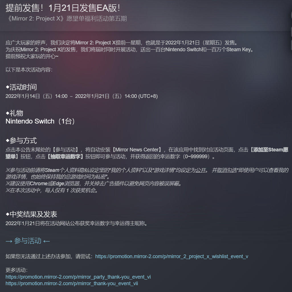 成人三消游戏《Mirror 2: Project X》官方宣布将在游戏发售当天(1月21日)送出一百万份游戏兑换码,参与方式暂未公布。