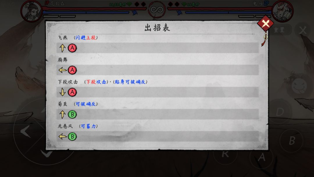 *取消:A招式的前摇可以结束B招式的后摇我们就称这个A能取消B。比如AAA连按就能快速打出三下A。与之相关的概念有放帧。你可以简单理解为按得慢一点。比如A——A——A这样就是放帧。这种快慢的输入节奏又延伸出目押。