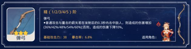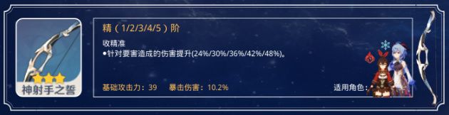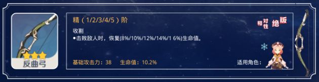 目前唯一一把生命值副词条的弓!宝箱开完了,NPC也拿了,如果融掉了就没了!满级生命值46.9%,是前期冰猫的3★毕业武器。