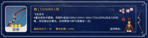 这两个区域的宝箱摸完了,熔了就没了!满级暴击伤害31.8%,武器效果是物理伤害,被玩家称为“偷boss专用弓”“爆头弓”,适用于安柏及甘雨,不过甘雨更建议用神射手。(关于信使和神射手,非蓄力信使伤害高,蓄力神射手高,打物抗高的怪信是要差一点。)