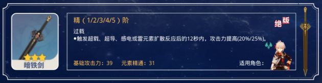 目前仅此一把!不小心熔了就没有了。满级有141点元素精通,使用作为万叶的前期的过渡武器使用,搭配雷系角色可以吃到武器效果。