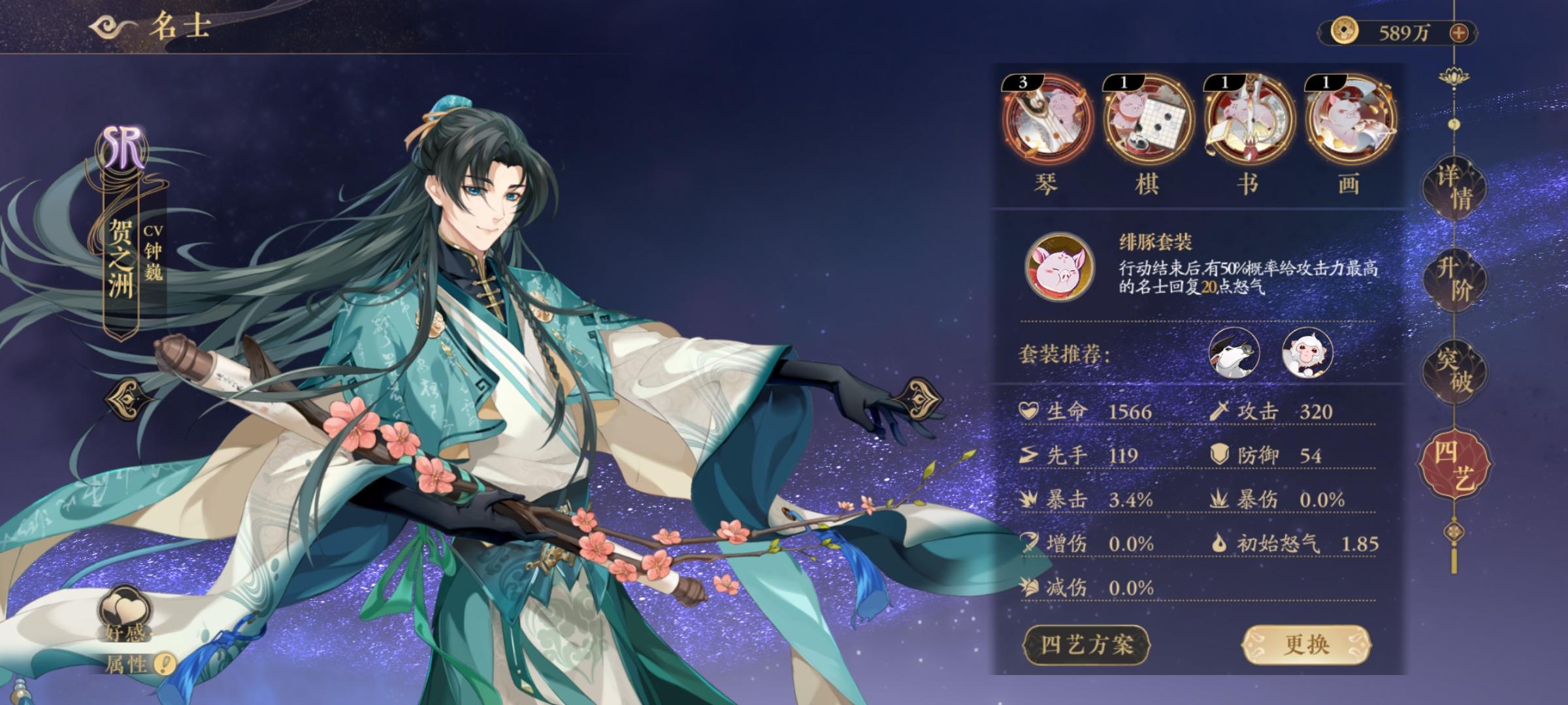 名士:贺之洲pve神卡 带他!退条回怒,驱散眩晕,自己还肉,绝了。(打pvp就没必要带了,没有几个人不带月灵)