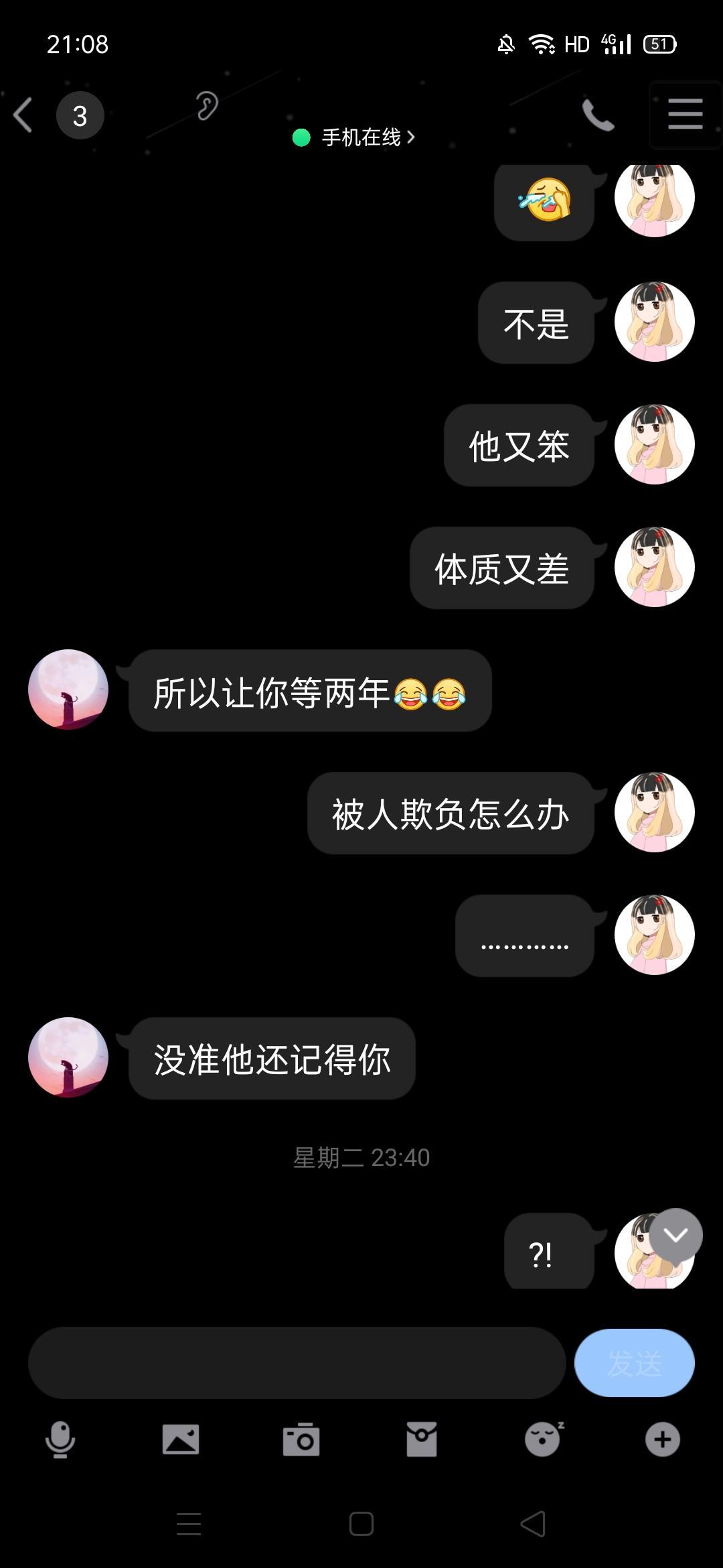 in2021 他说过这样的话然后2天或更短删好友跑路了。并且后来他的相亲对象用他的账号跟我说了一些很恶心的话,还要用她自己的手机号打电话给我。对不起,我能有的截图只有这偶然幸存的一张了,其他的随着我生气摔了的手机碎了。在2022年1月1日,那位女士还说“你们的事情关我什么事”做了那样事情的人如是说。我大概是被那位主人公逼疯了,她嚣张的打电话说着根本没有和谈意思的伪善言辞,由于愤怒我说了不能显示的话,还被半夜1点叫起来喝茶了。由于电话监测导致最后没什么大事了。