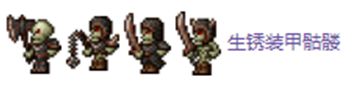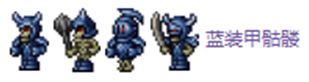 近战攻击,被其攻击到后有50%几率获得破损盔甲减益,破损盔甲减益会使玩家的防御力减半。蓝装甲骷髅小概率掉落盔甲抛光剂,盔甲抛光剂能免疫破损盔甲减益,且可以用于制作十字章护身符的子材料盔甲背带。