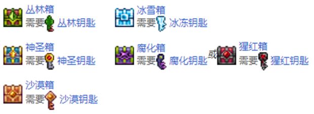 在击败血肉墙后,击败敌怪有极小概率掉落其对应环境的钥匙,但这些钥匙的介绍都有“它已被一个强大的丛林生物诅咒”,因此无法使用,在击败世纪之花后,这些钥匙的介绍就会改变,并可以去开启地牢中的这些特殊箱子,这些箱子中必定会有一把对应其箱子类型的武器: