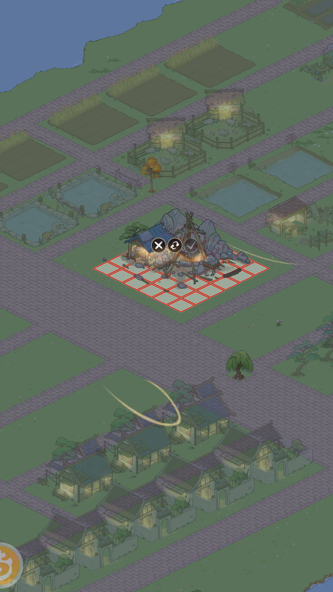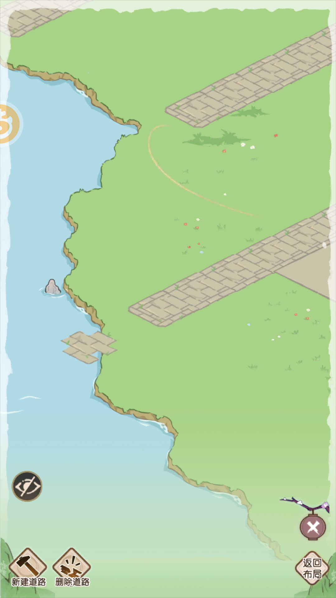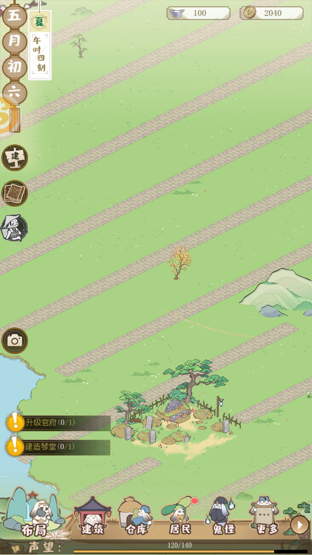 如图一:捉鬼的小游戏我不会玩,希望那个指导能随时查看。我记不住医馆长啥样,医生我都没反应过来怎么点。为了认识医馆,我停下游戏把乱七八糟的建筑分类摆放,但是地基模式不能改布局,只能修路,为了一时的整齐,我把路修成了网格线,这样建筑才不会一下子上一下子下。其实我觉得可以学学隔壁百景图,修路的逻辑简单一点,没必要分成修建和删除两个,重复涂抹就是删除,这样快一点。最好还是有地基模式改布局,这样对齐容易。不然建筑物遮挡网格线,真的很难对齐。我想把树木整齐地种在建筑之间也被挡得找不到下手的地方。
