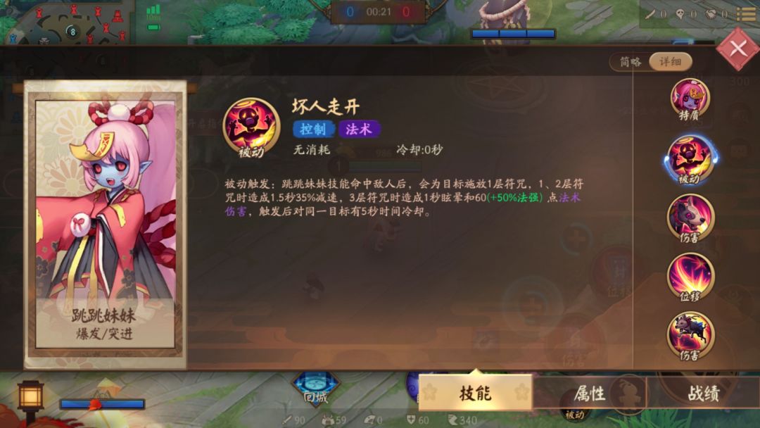 被动:坏人走开。跳妹每次释放技能击中敌人或是小跳击中都可以叠加一层标记,标记满三层爆炸完成眩晕和伤害。这个被动对于小兵和野怪同样使用(不适用于石距等大型野怪)。这个被动也是跳妹主要的控制手段,和输出手段之一。通过这个被动可以让跳妹在团战中迅速切入后排控住敌方主要输出并击杀。