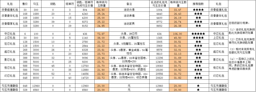 (4)一百块以上的礼包总价值基本上相同,贵的忍阶礼包要考虑欧皇非酋体质