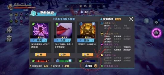 在贤者神殿,会给你提供随机技能,如果没有你想要的,就点击下方的刷新,会有几率出你想要的技能哦。这个刷新价格是固定的100,不会根据次数涨价。(PS:我这还是打了好久才发现居然还能刷新,希望我不是最后一个知道的)
