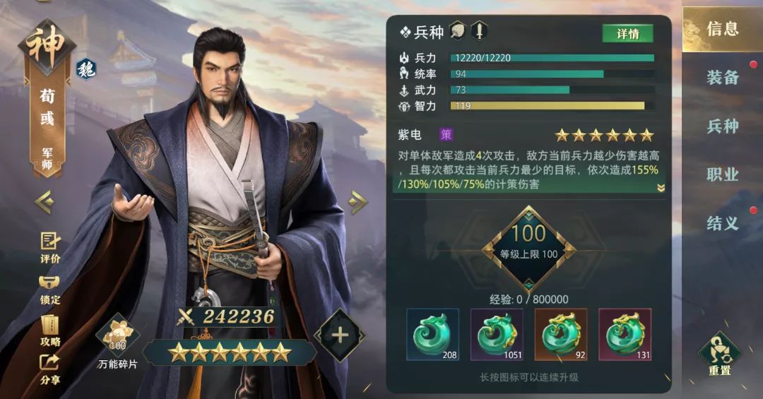 6星时,由于荀彧的技能附带了敌方当前兵力越少,伤害越高的效果。在实战中,在对方兵力已经最低的情况下伤害还越来越高的技能,基本上就是附带斩杀效果了,虽然技能可能会命中不同的目标,但是只要被命中其中的2-3次,敌方兵力最少的部队会受到大挫。
