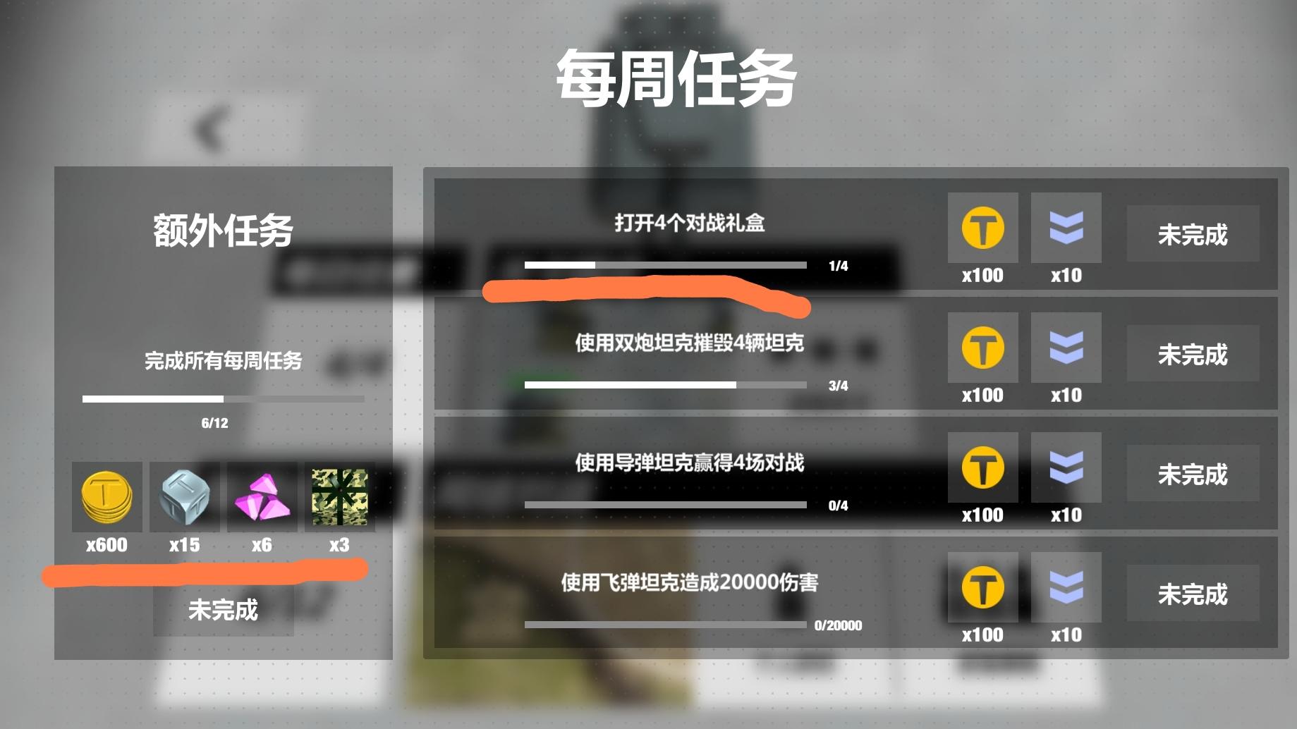 建议作者改一下,每周任务中有个任务是打开四个对战礼盒,但要把全部任务完成才能获得三个礼盒,所以这个任务完成不了。