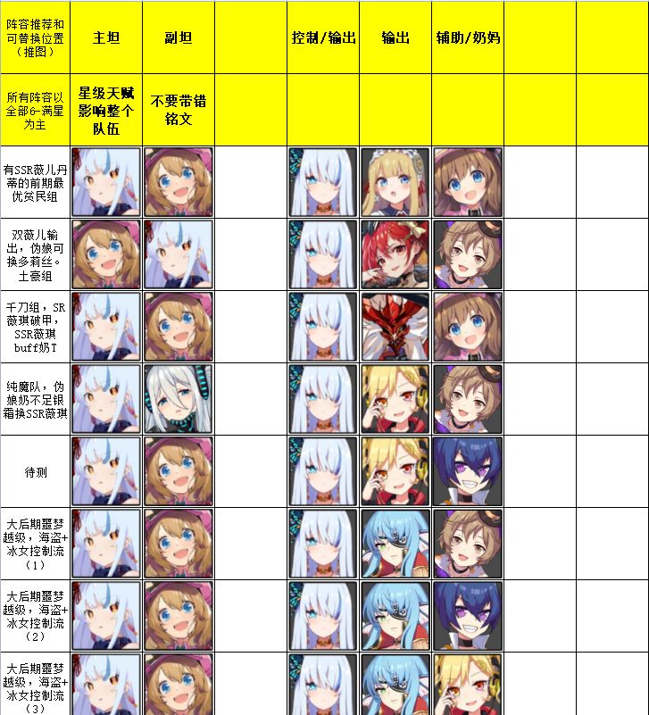 图示阵容均以星级最高为主(萌新星级不高怎么办?,前期用贫民组就可以,没有人偶怎么办?可用的群减伤T弗莱卡,闪避t乌鸦哥,生存T洛古,拜耳琪雅虽然是输出,但是可以作为副T使用,控制类型t蕾芙)