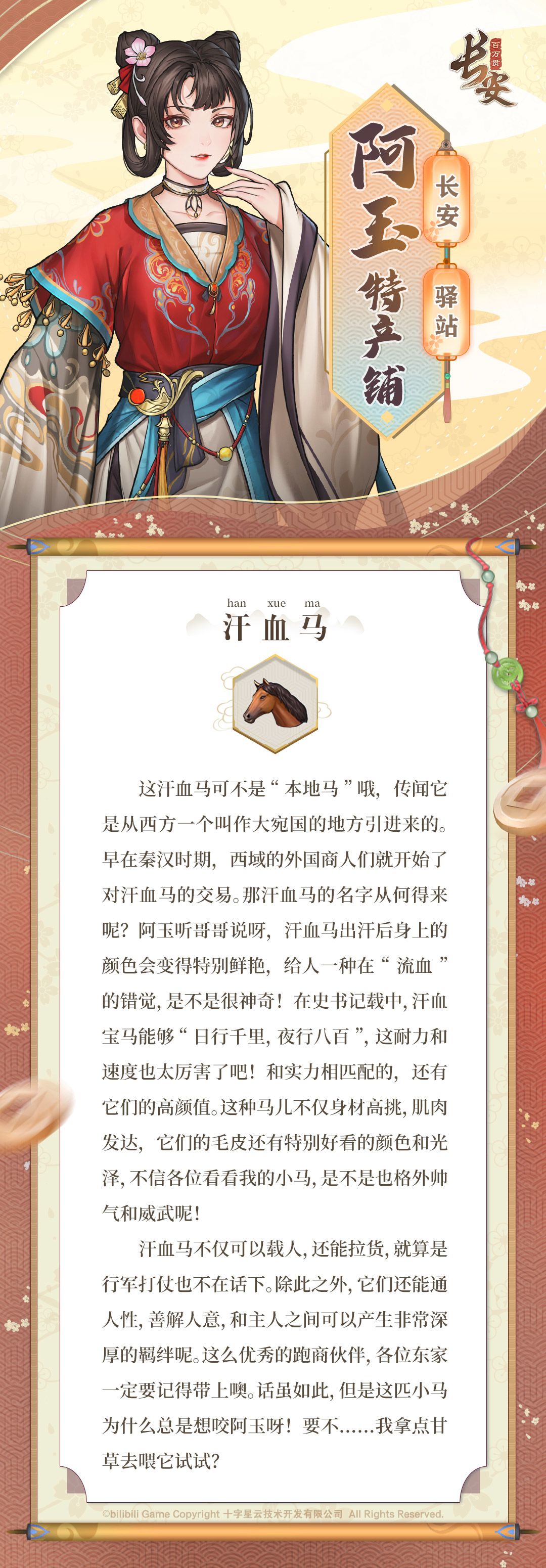 汗血马不仅可以载人,还能拉货,就算是行军打仗也不在话下。除此之外,它们还能通人性,善解人意,和主人之间可以产生非常深厚的羁绊呢。这么优秀的跑商伙伴,各位东家一定要记得带上噢。话虽如此,但是这匹小马为什么总是想咬阿玉呀。要不……我拿点甘草去喂它试试?