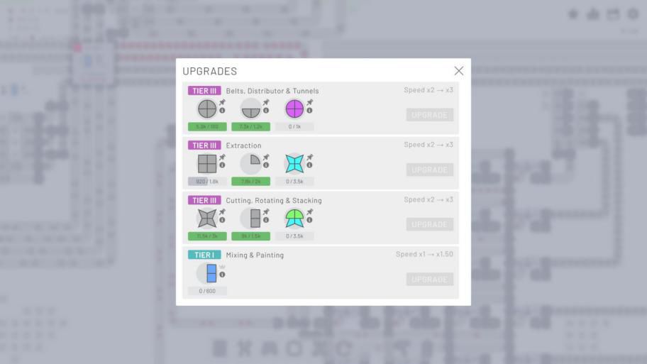 游戏和目标和规则很简单:如上图,在可无限扩展的地图上,开采出基本的图形(包括形状、颜色、虚拟电子信号),然后通过各种逐渐解锁、升级的工厂设施来组合创造出各种“奇形怪状”。