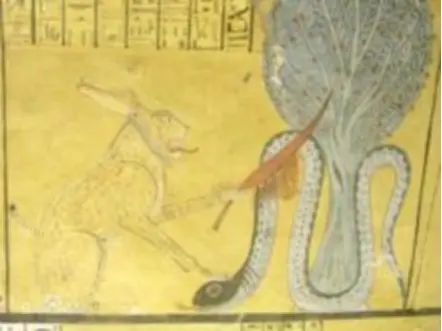 3、对第七幕出现形象“黑色巨蛇”的两种猜测:(1)、结合其画面背景来看,疑为北欧神话中的大蛇耶梦加得,其于芬布尔之冬中向诸神宣战。(2)、根据光暗战争的象征意义,疑为埃及神话中的大蛇黑暗之神阿波菲斯(阿佩普),黑黄相间的身体由土和水组成,让世界陷入永久黑暗,带领惧光的罪人逃出囚禁。