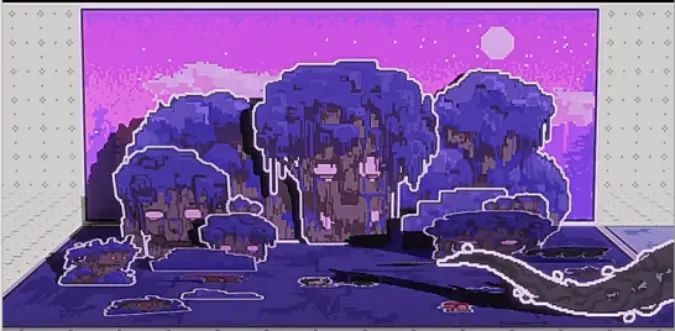 场景中央的大巨像消失,取而代之是奇怪的树以阴影的方式显示,画面骤暗。