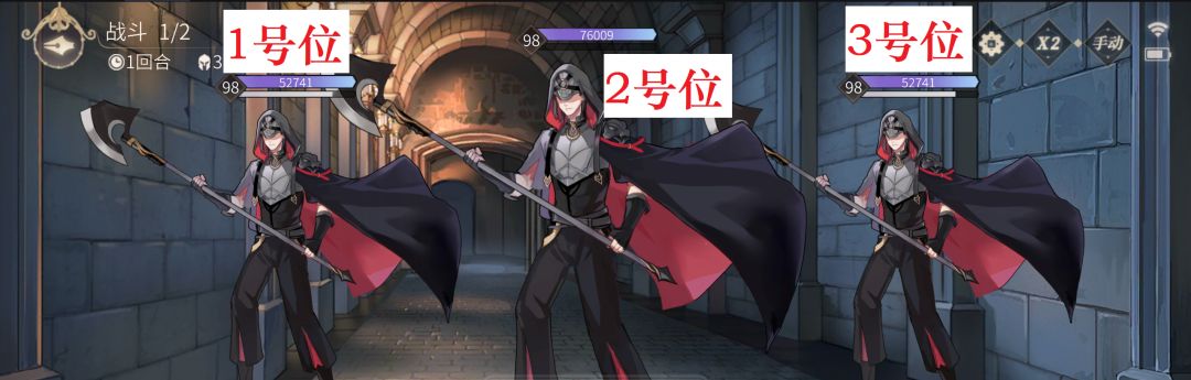 已知敌方2轮都会是这3个斧头人(x),普攻均为aoe伤害。左右2个生命较低,特技是群体伤害+增加防御,开局进去条近乎满着。中间那个特技为群体回血,开局进去没有特技进度。为了方便我们把他们从左向右依次分为1,2,3号位。