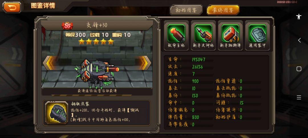 交锋算是前中期最好用的主肉,没有之一。肉度主要靠抗性和闪避支持,回血非常容易回满。同时它也是前中期唯一一个自带嘲讽的车,可以选择省下一个位置,中期也可以不选择带钢盾只提升自身肉度,而是配一个高攻击辅助(天狼,火星都是好人选)带苏珊增加全体抗伤能力,在深渊16到30极度舒适,即使是在偏后期的31到45我用的也非常舒服。