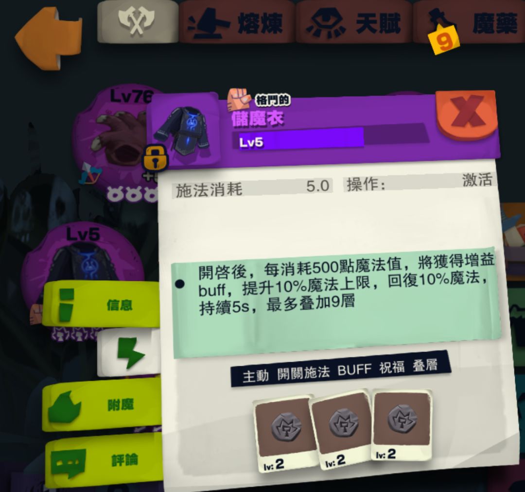 儲魔衣:消耗魔法值,獲得增益。