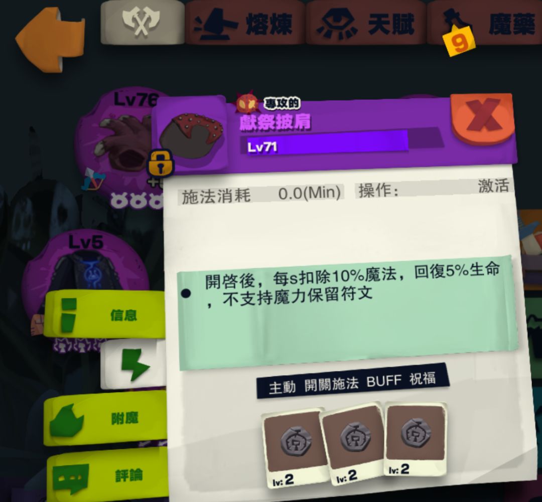 獻祭披風:扣除魔力,回復生命。
