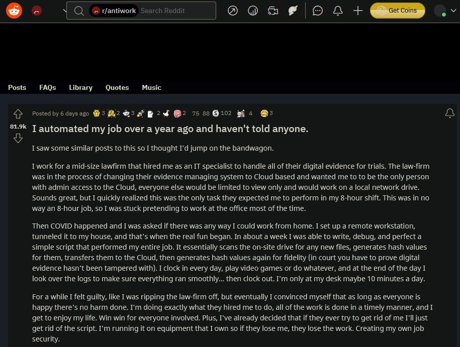 Reddit 用户 Throwaway59724 出于显而易见的原因更希望保持匿名,大约一周前,他在 r/antiwork(‘反工作’小组) 上发布了关于他在疫情期间使用的编程漏洞。帖子详细介绍了一年多前他们如何设法使单调的日常工作自动化,令人惊讶的是,公司中的任何人都没有发现这种诡计。