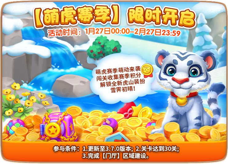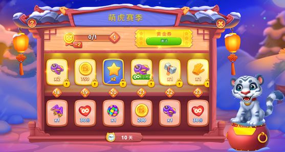 活动玩法:边闯关边累积赛季积分,解锁赛季获得阶段性道具;使用黄金券,相同阶段获得额外奖励,还有集可爱与帅气为一体的小白虎乖巧地朝我微笑。小脑斧,等等我,妈妈这就接你回家!!!