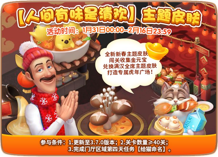 活动玩法:活动期间内,主线关卡闯关,收集道具兑换绝美的中华美食皮肤。滴答,秃秃喜悦的眼泪从嘴角流下,最后滴落在地,留下一圈水渍。