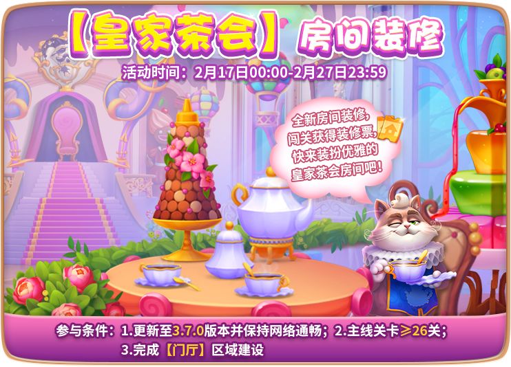 活动玩法:在活动期间内,闯关即可获取装修票,和秃秃一起把一团糟的皇家茶会收拾干净吧!