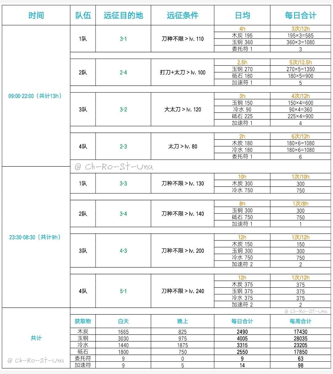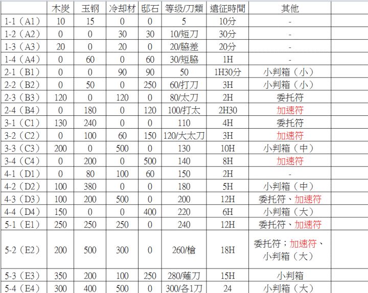 23.“无缝远征”——指合理算好时间,尽可能不耽误每一分钟地安排远征队伍,尽可能多的获得收益。(帖末附一张已经很古老的最大远征收益表)