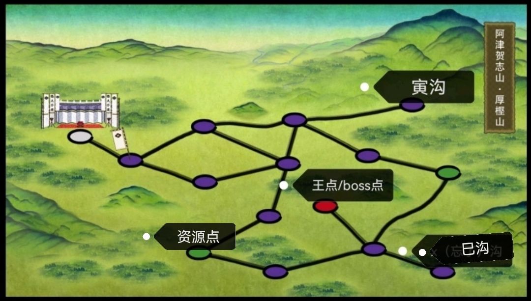 9.“道中”——是指进图后,尚未遇见boss的所有道路上的紫(深蓝,战斗)、绿色(资源)点。