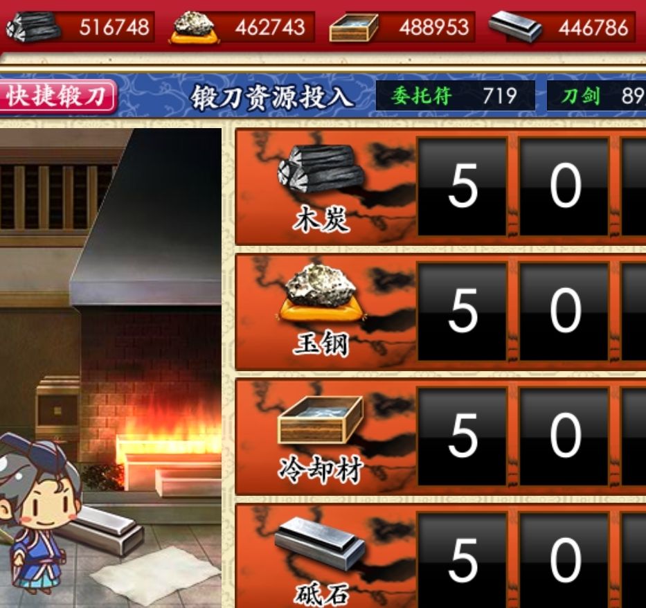 锻刀需要四种材料,以及委托符,想要迅速锻造完成可以使用加速符,想要提高获得稀有刀的概率可以使用御札。