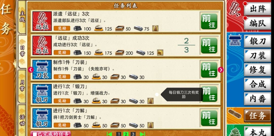 大家说的日课很多时候是在说每日锻刀任务,每日前三次锻刀有任务奖励。一般选择all50,或者all350,限锻期根据限定刀需要的资源决定。