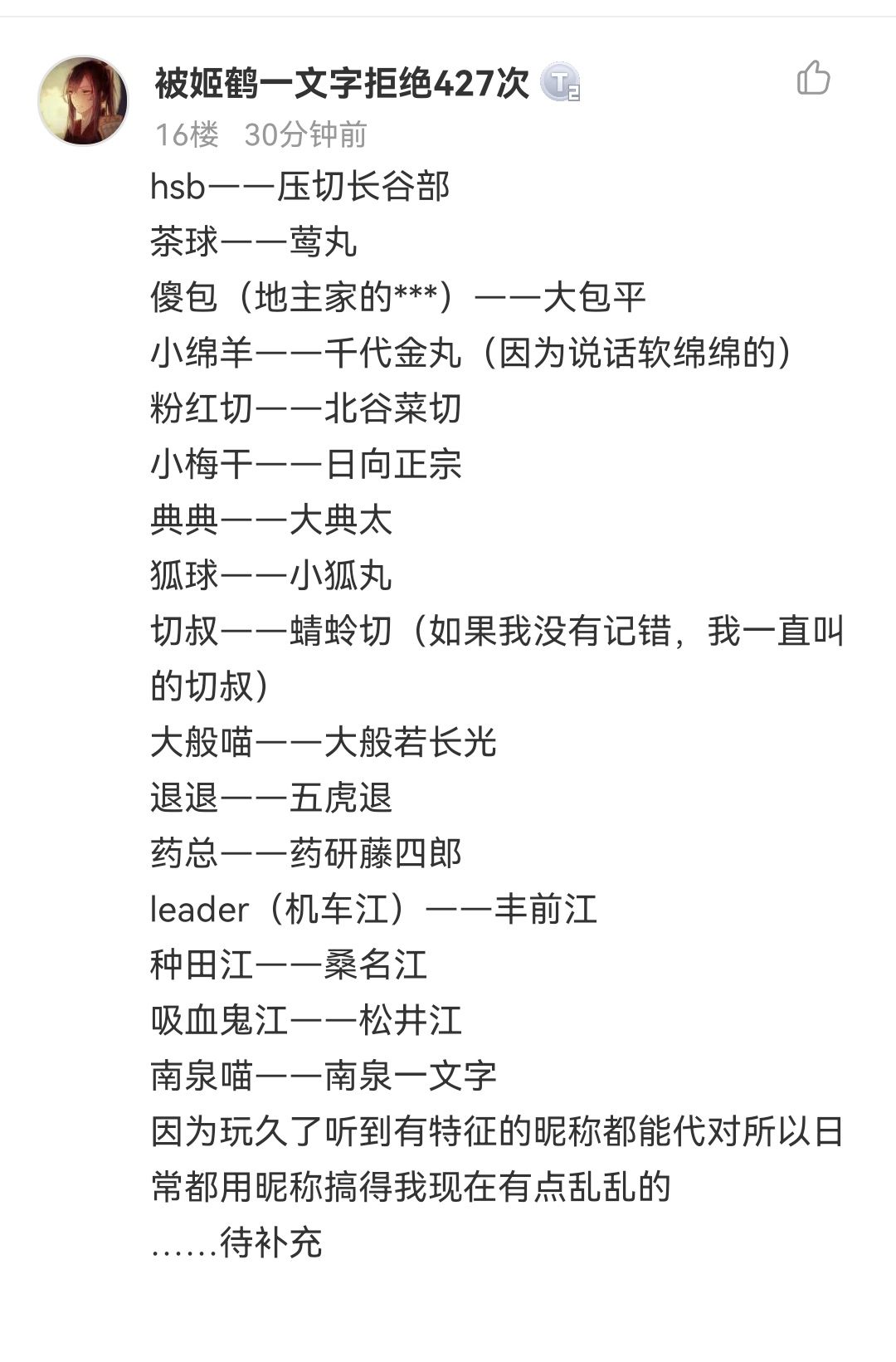 我一点也不想踩到哪怕一点点玩家的雷,就写一点别人的捞刀贴里可能会出现的称呼吧。
