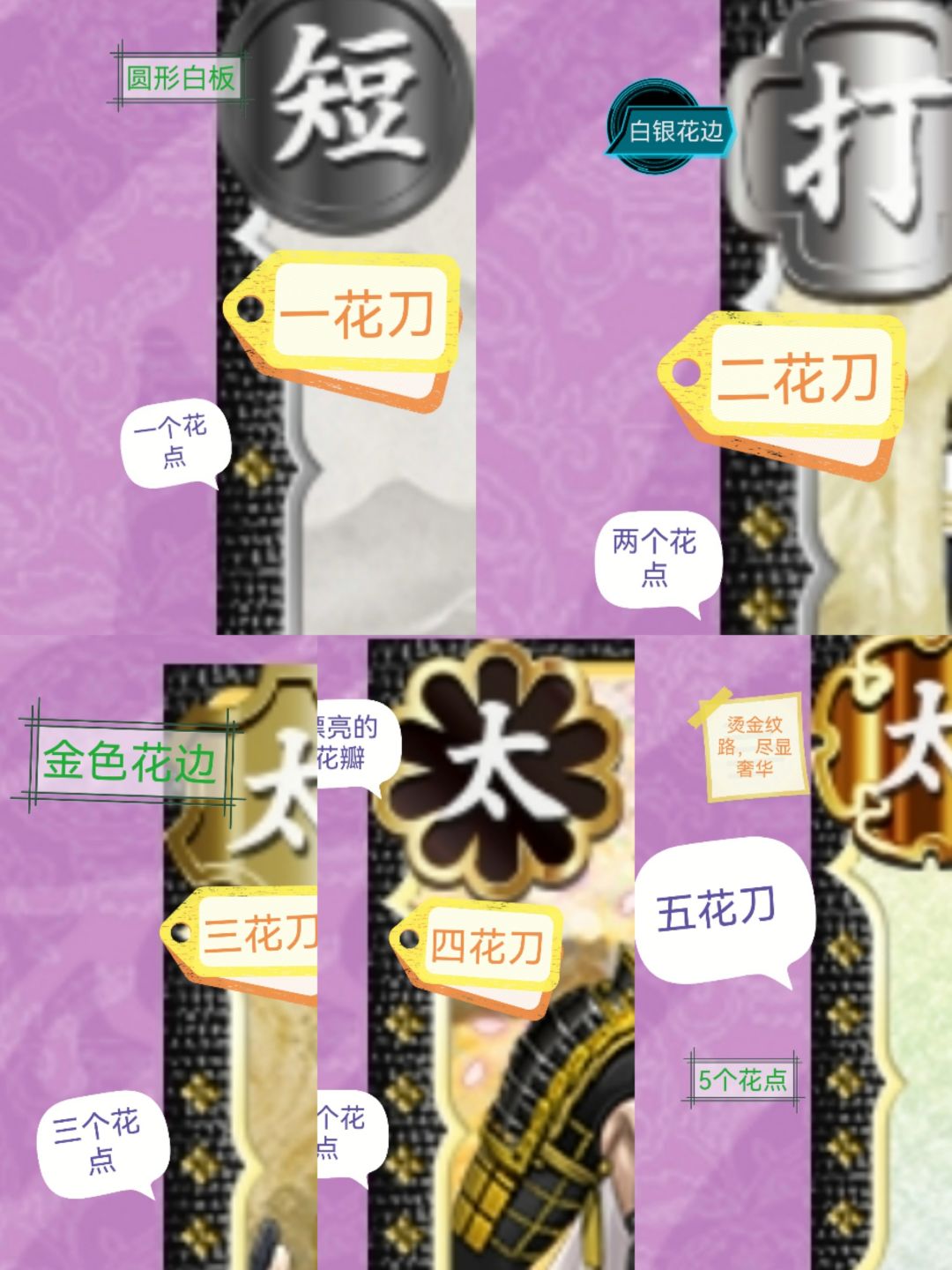 这是在锻刀履历里看的,平时在编队或者刀帐中看,则是要看左上角及以下,从[剑]字位置上的花,以及左边的边框。