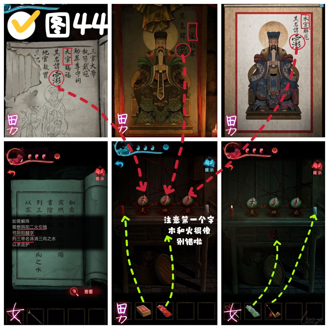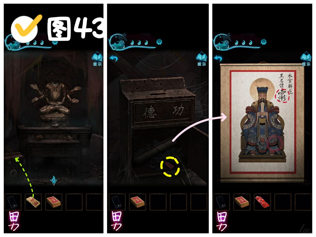 【蓝·申墨卿】返回村口,左转进入小庙,将拜神金纸投入功德箱,拿到〔阳喜字〕,打开卷轴,观察水官大帝的画像,记住右上角水官的名讳。(图43)