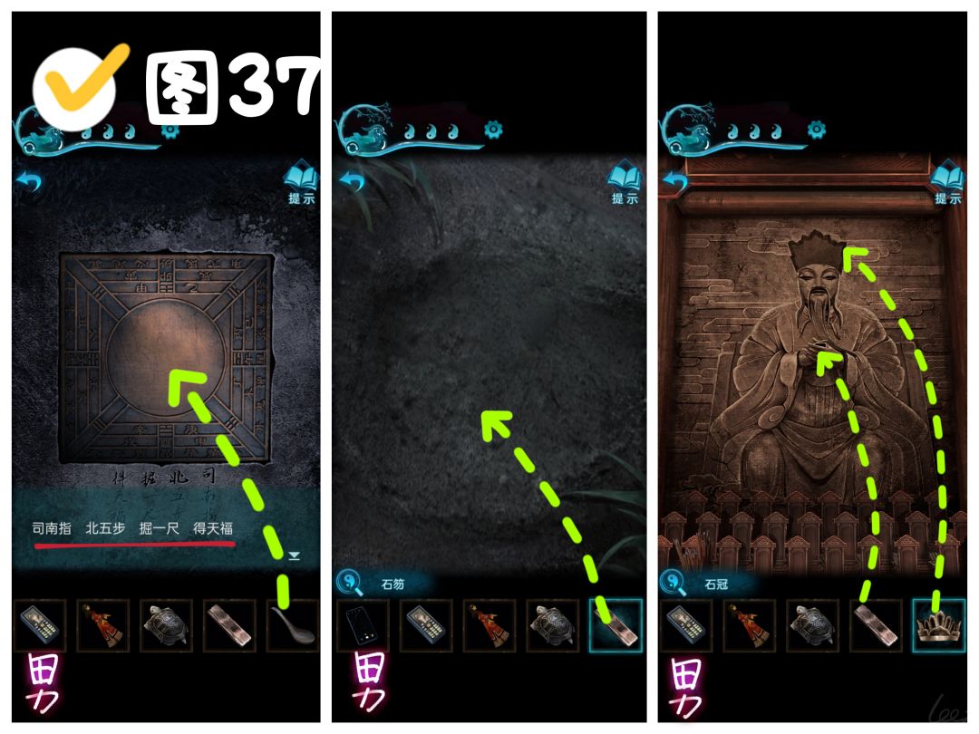 【蓝·申墨卿】离开祠堂,村口左转,将磁勺放到棋盘上方的司南上,“司南指,北五步,掘一尺,得天福”,用石笏挖土,获得〔石冠〕。